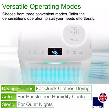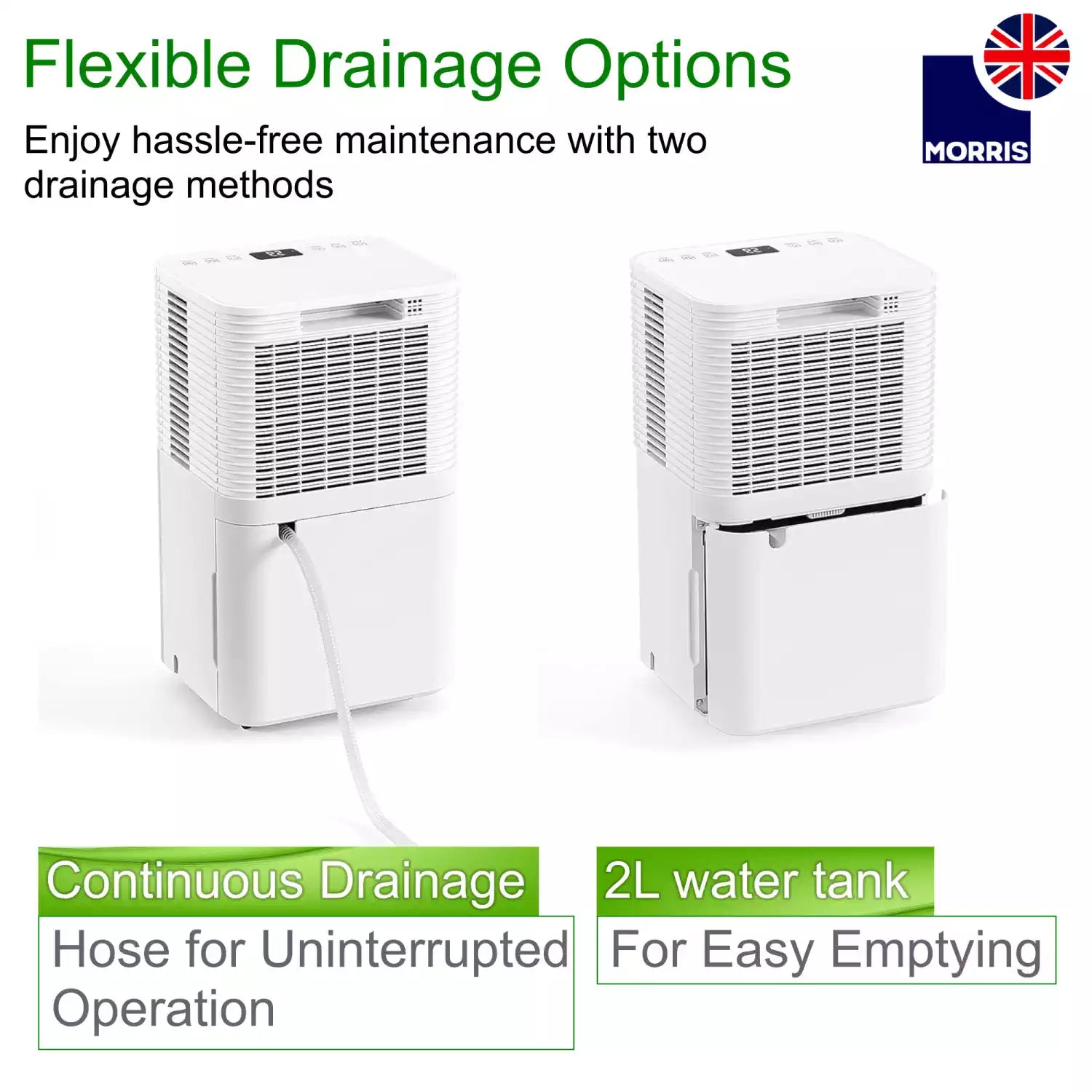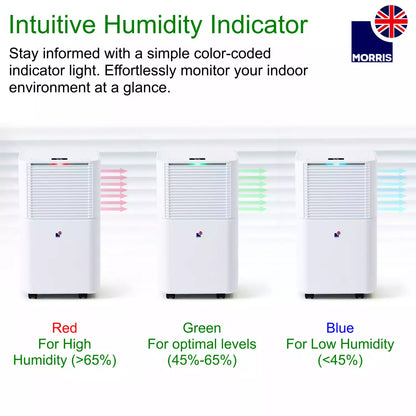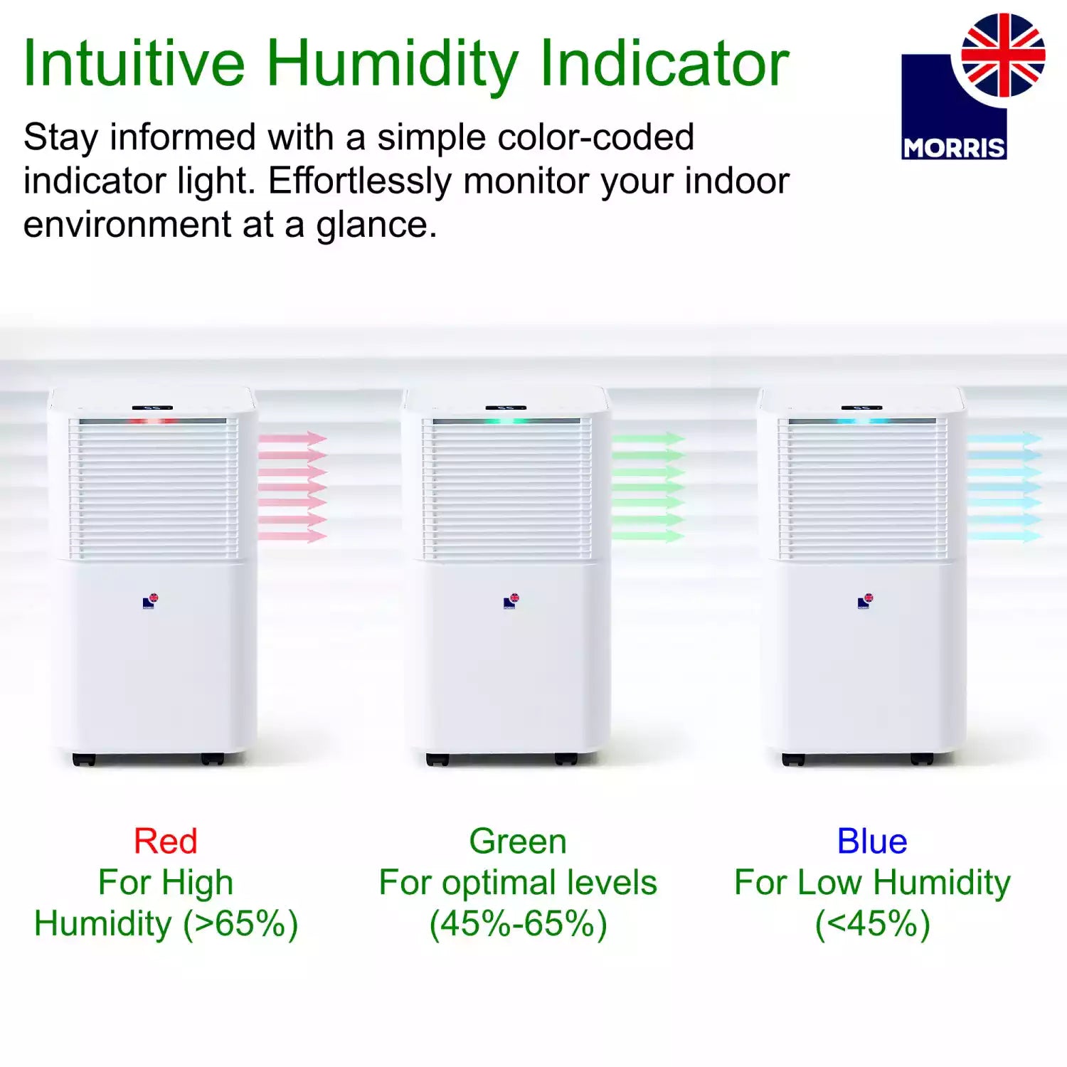 Morris low energy dehumidifier features a 2-liter tank with an alert system, ensuring continuous operation without the risk of overflow.