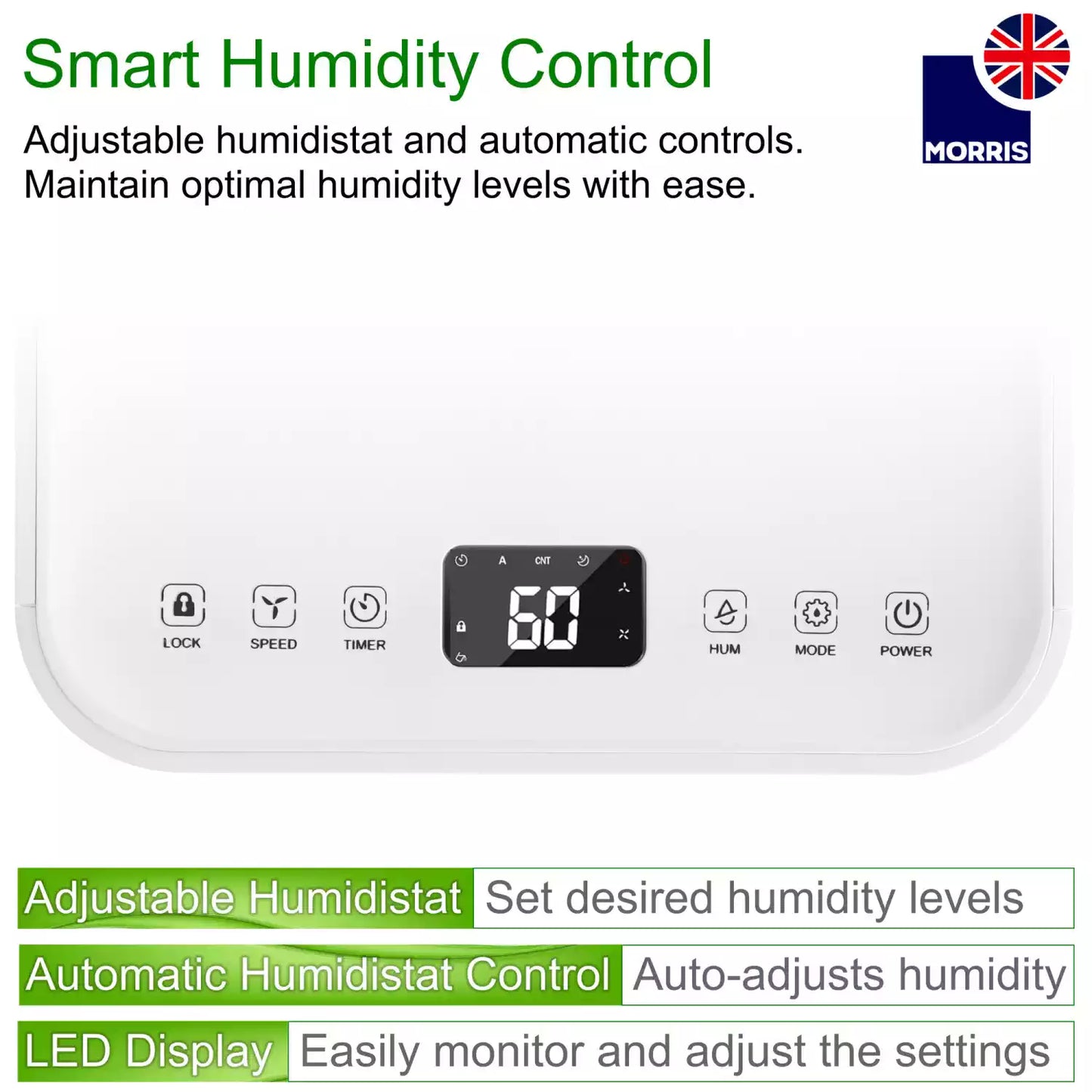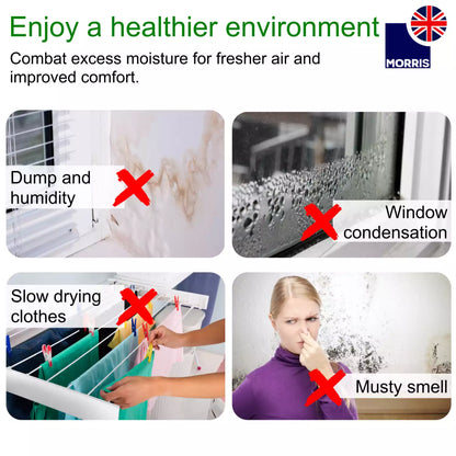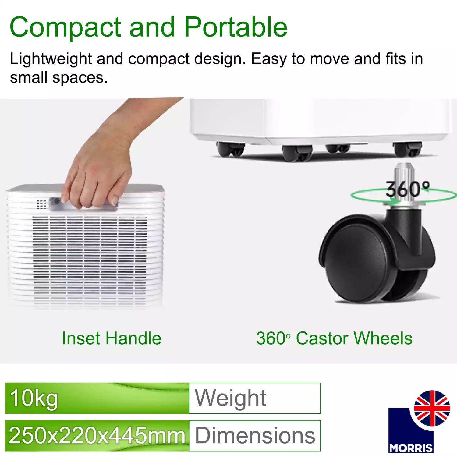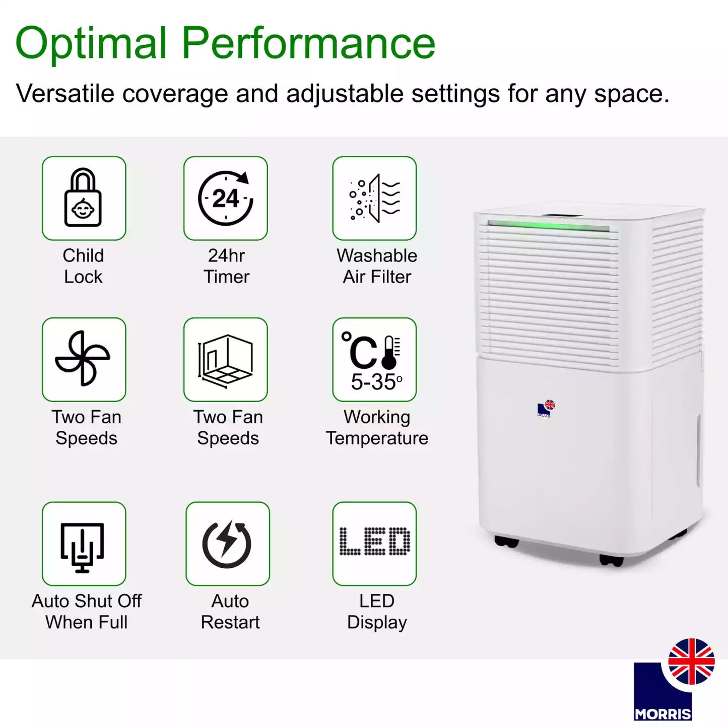Morris low energy dehumidifier features a 2-liter tank with an alert system, ensuring continuous operation without the risk of overflow.